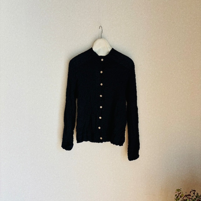 ★この商品は1点ものです。店頭での販売と行き違いになる場合も ございますので、ご購入前にお問い合わせいただけますと確実です。★ 素材 綿99% ポリウレタン1% サイズ フリー バスト100㎝ 着丈60㎝ 日本製 綿糸に強い撚りをかけることで、伸縮性があり軽やかで 扱いやすい素材に仕立てられたちぢみ素材のカーディガン。 皺を気にせずに持ち運びができるので、普段に旅行先での 羽織りにとおすすめです。