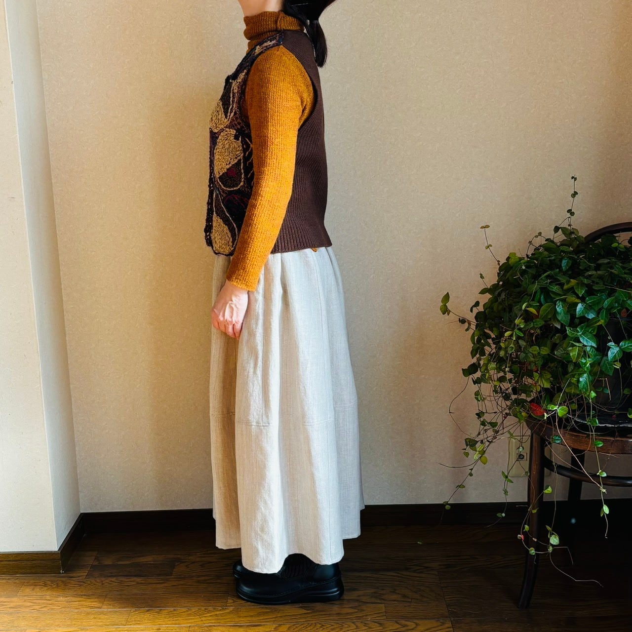 ころんとした洋梨柄を描いた、大胆なタッチの刺繍ベスト。