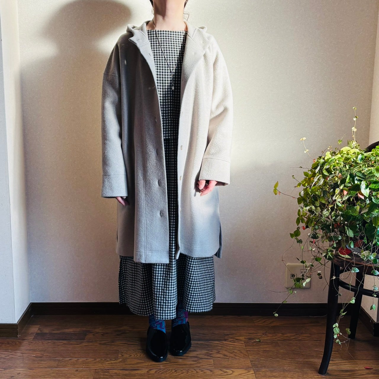 小さめのフードが、首元や肩周りをすっきりと見せ、