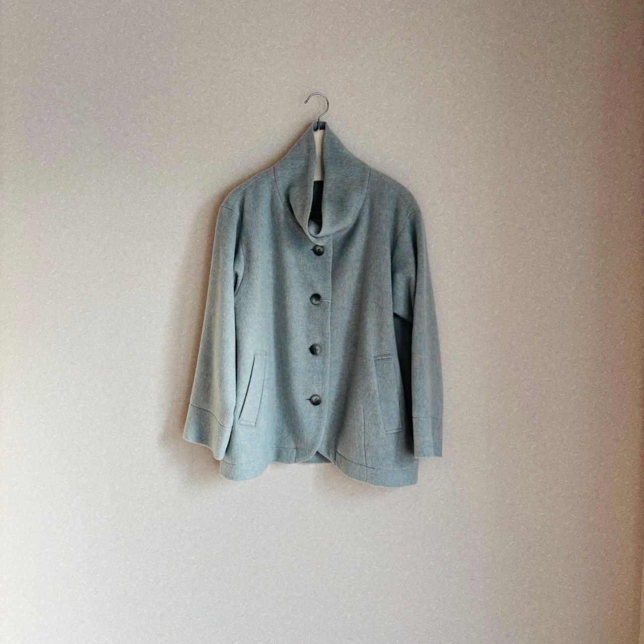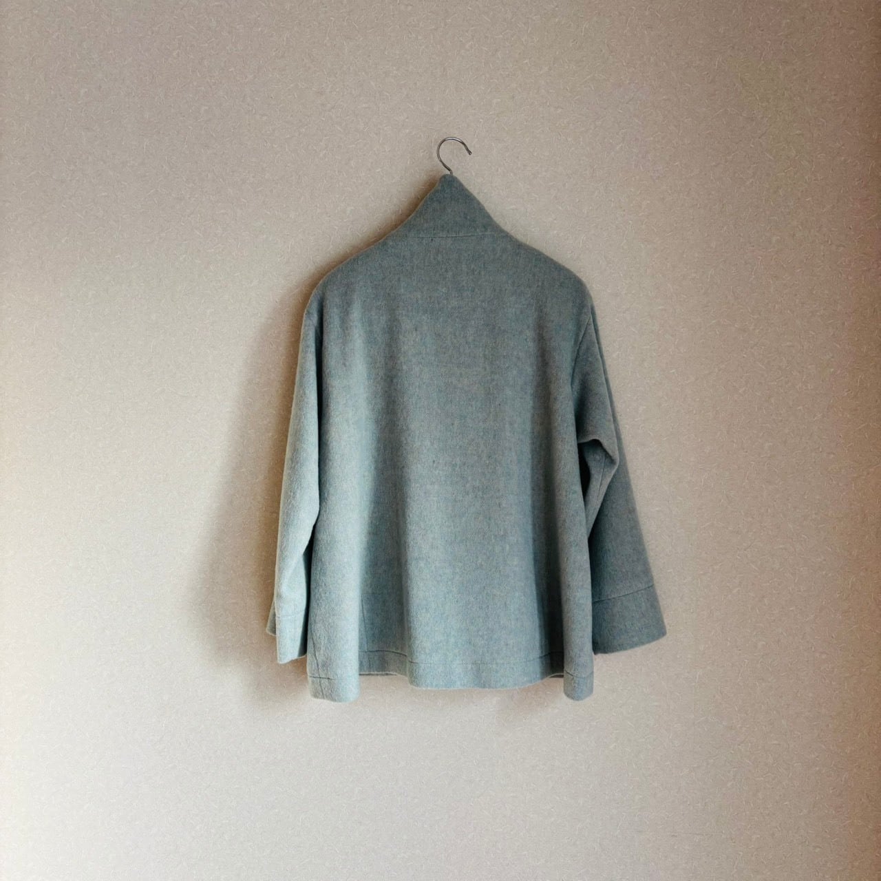 軽やかて柔らかい、ウールジャギーのスタンドハーフコート。