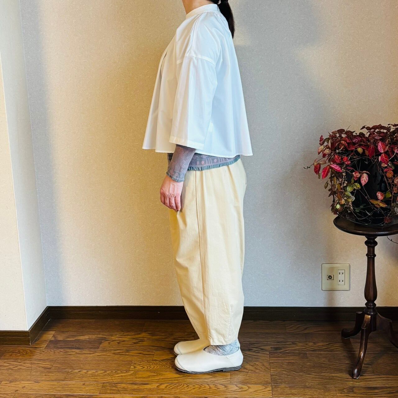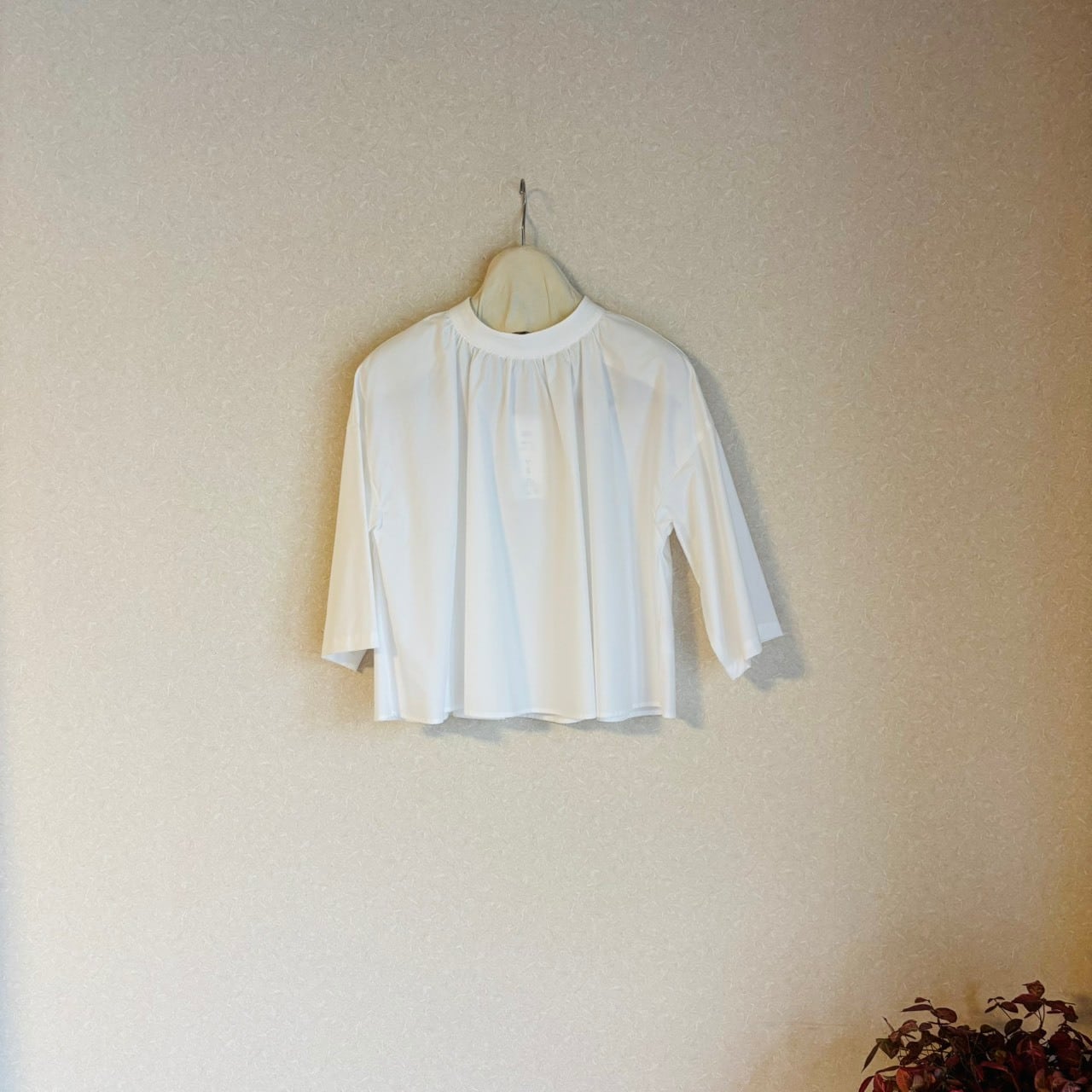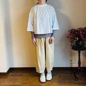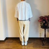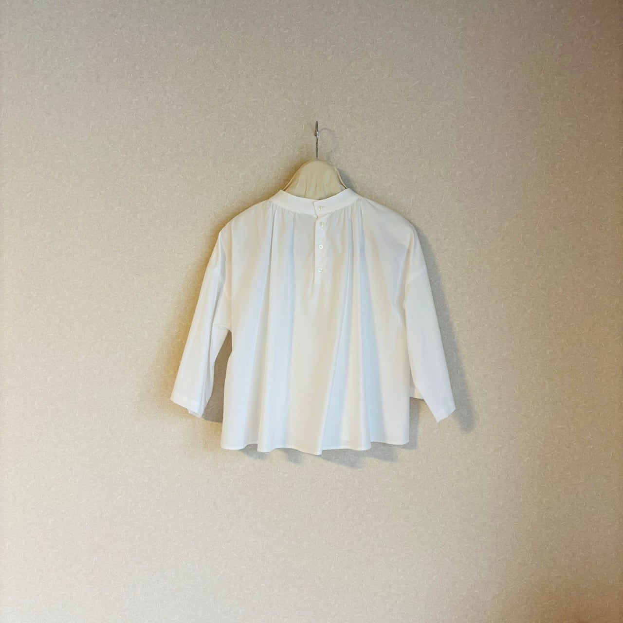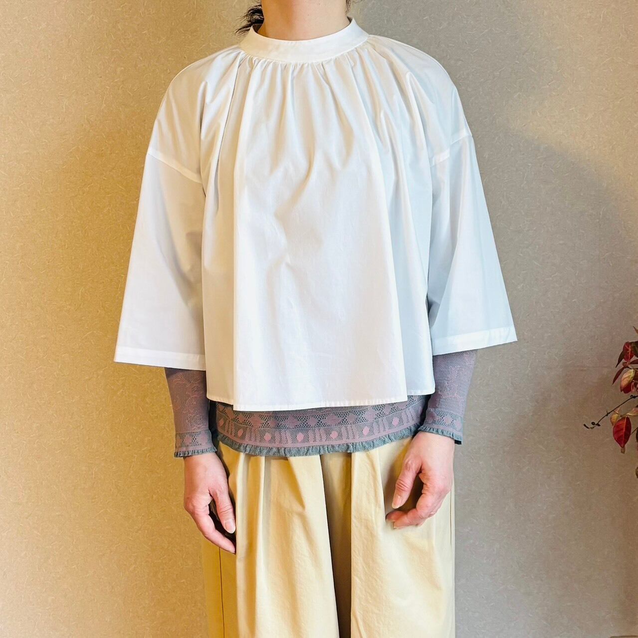 スタンドカラーにたっぷりとギャザーをとった七分袖のブラウス。