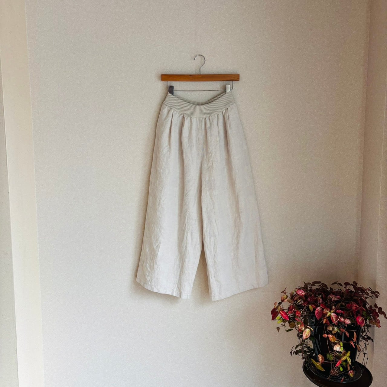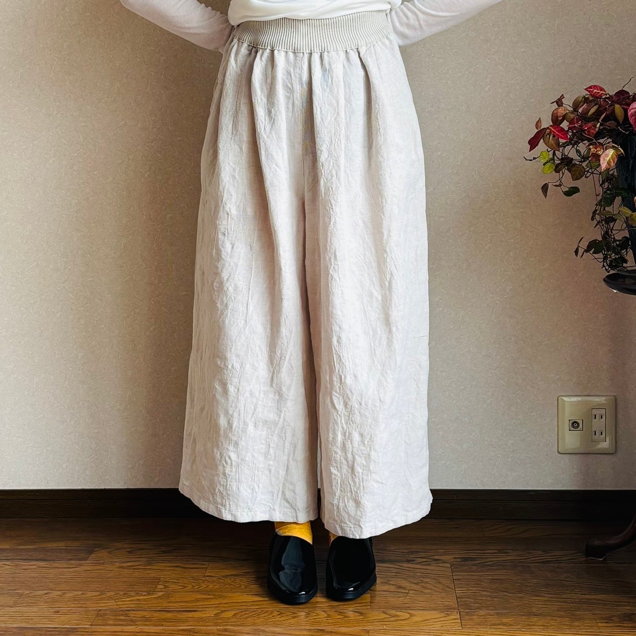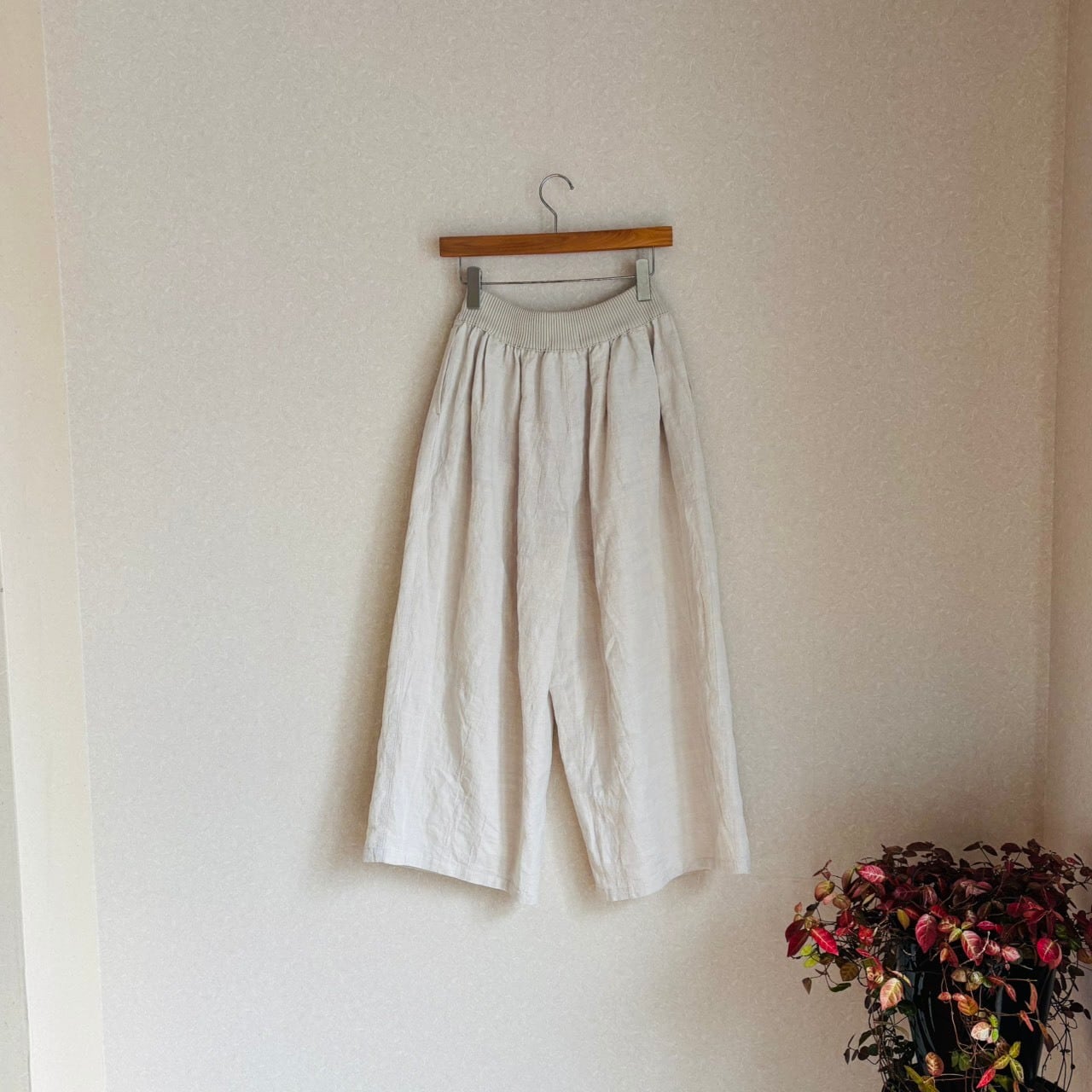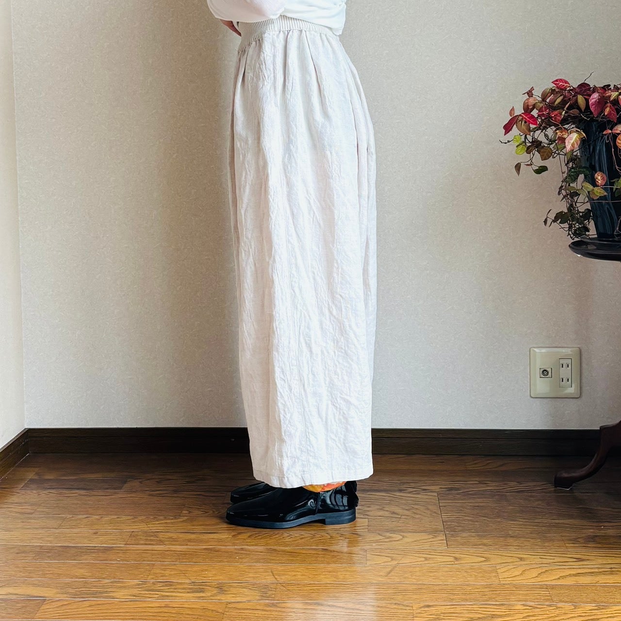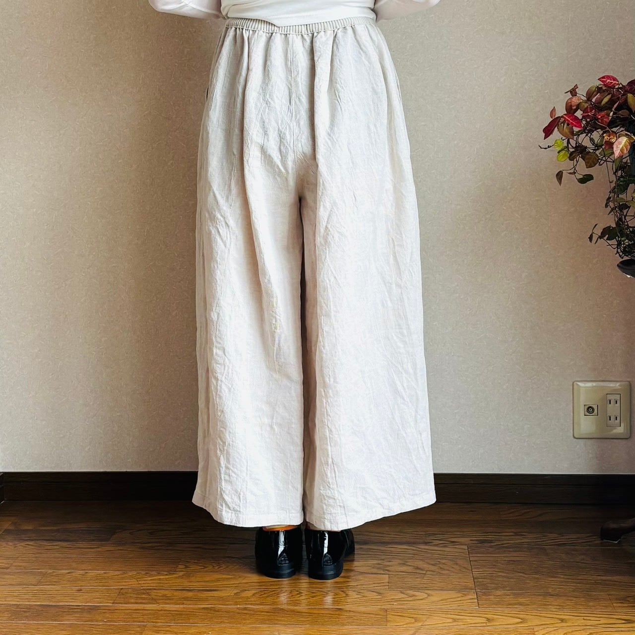 綿麻の軽くて着心地の良い、ジャガード織パンツ。