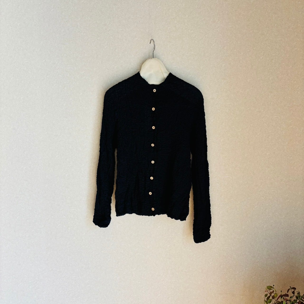 扱いやすい素材に仕立てられたちぢみ素材のカーディガン。