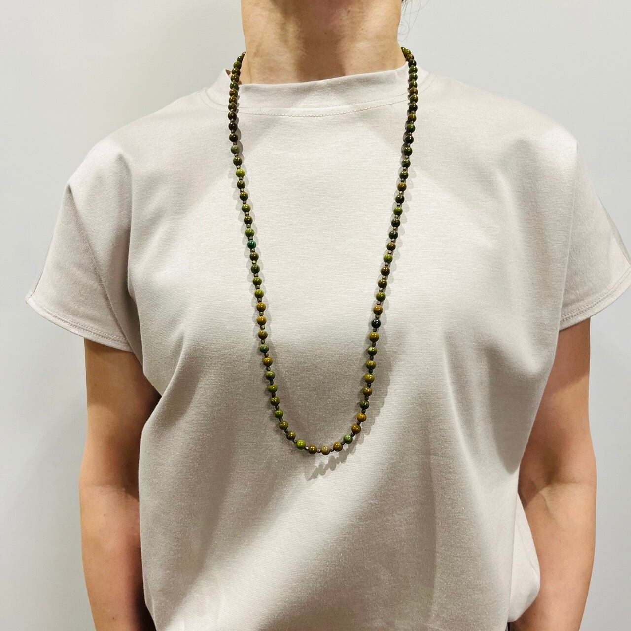 ジェムシリカ石と真鍮ビーズを組み合わせたロングネックレス。