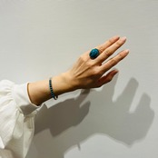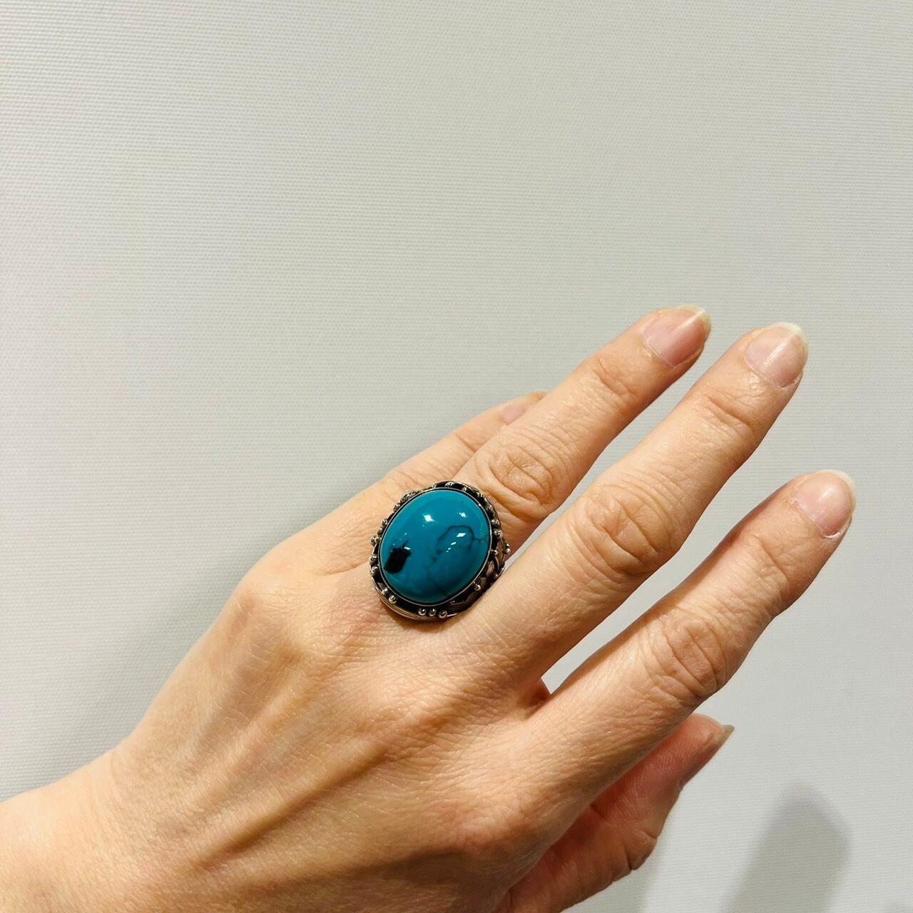 コロンと綺麗なターコイズストーンに雫やリーフのモチーフの台座のリング。