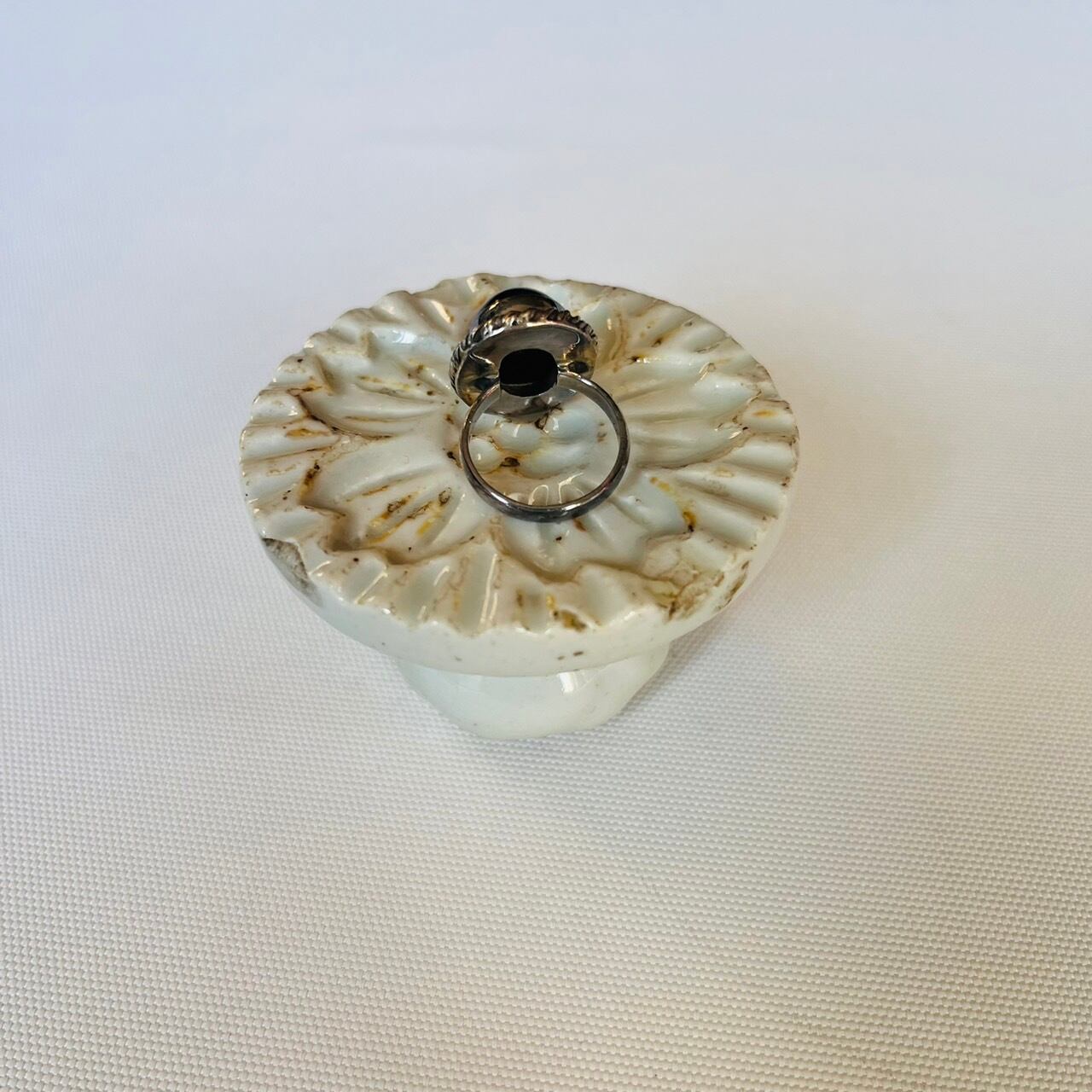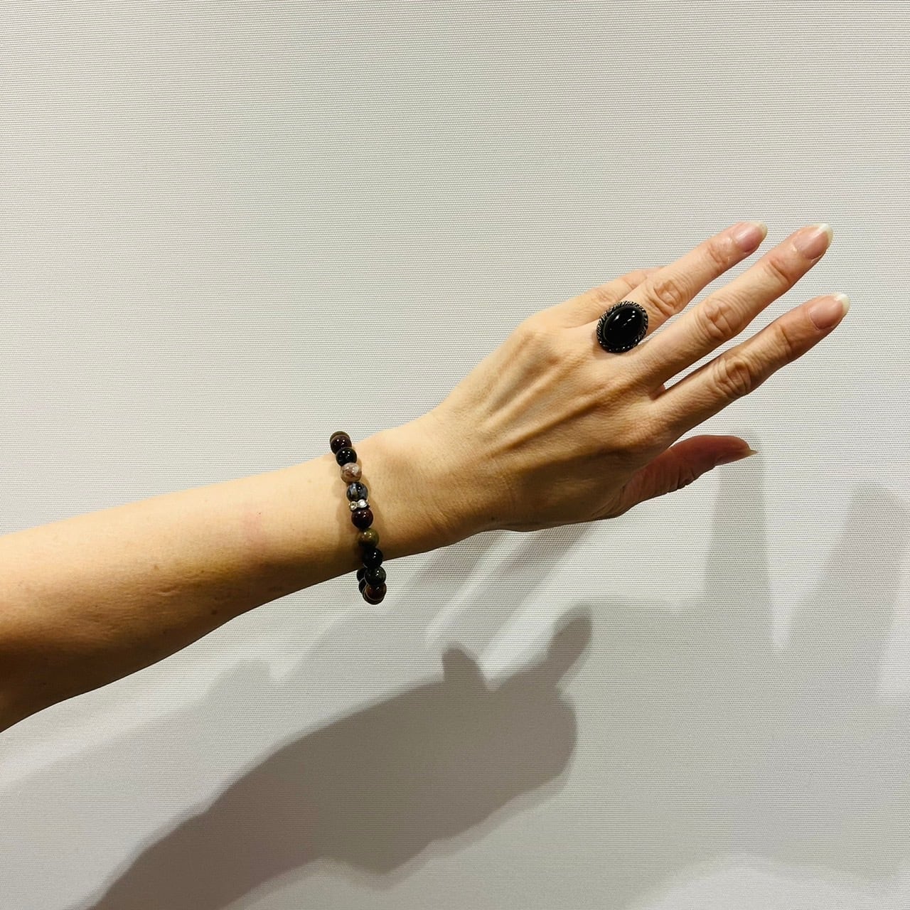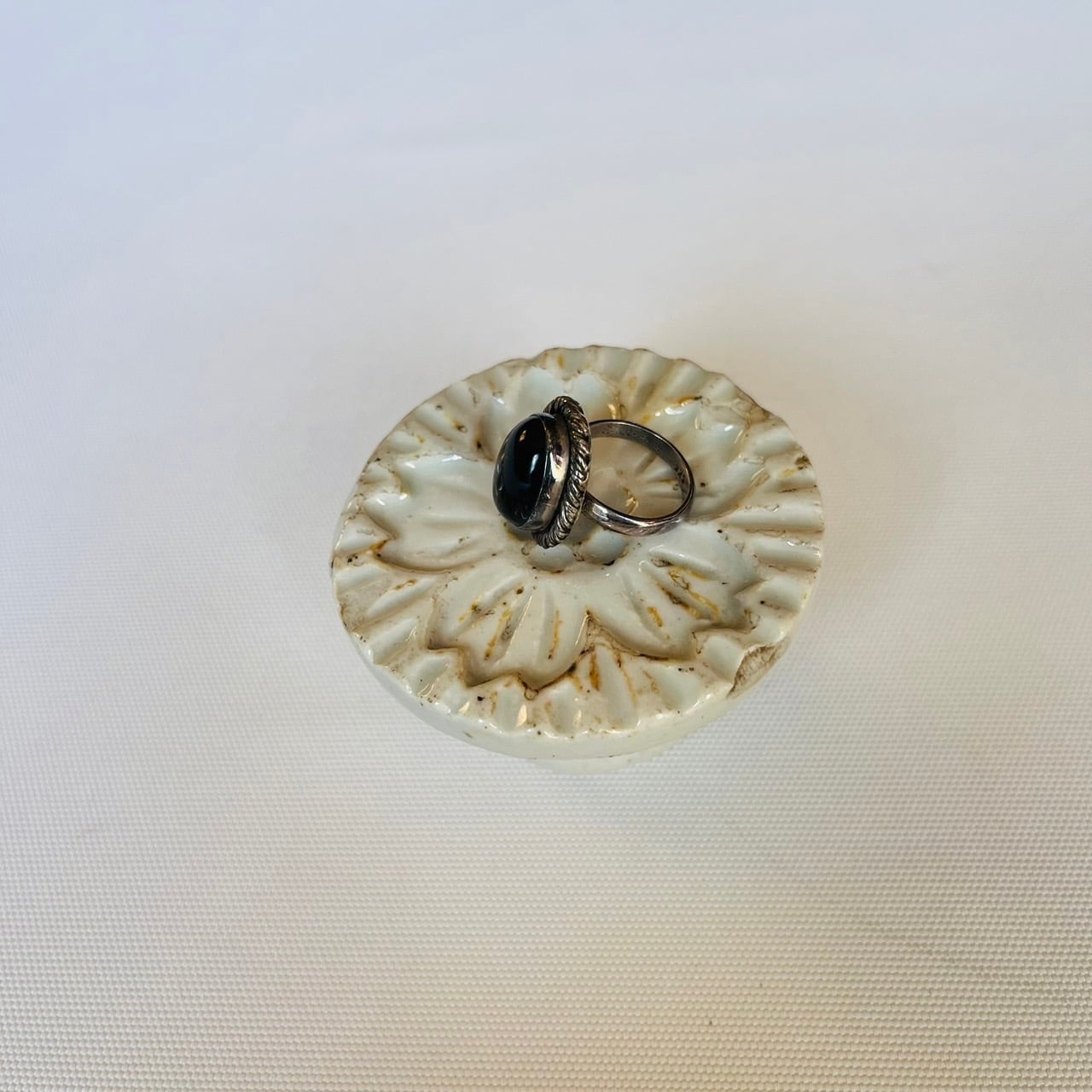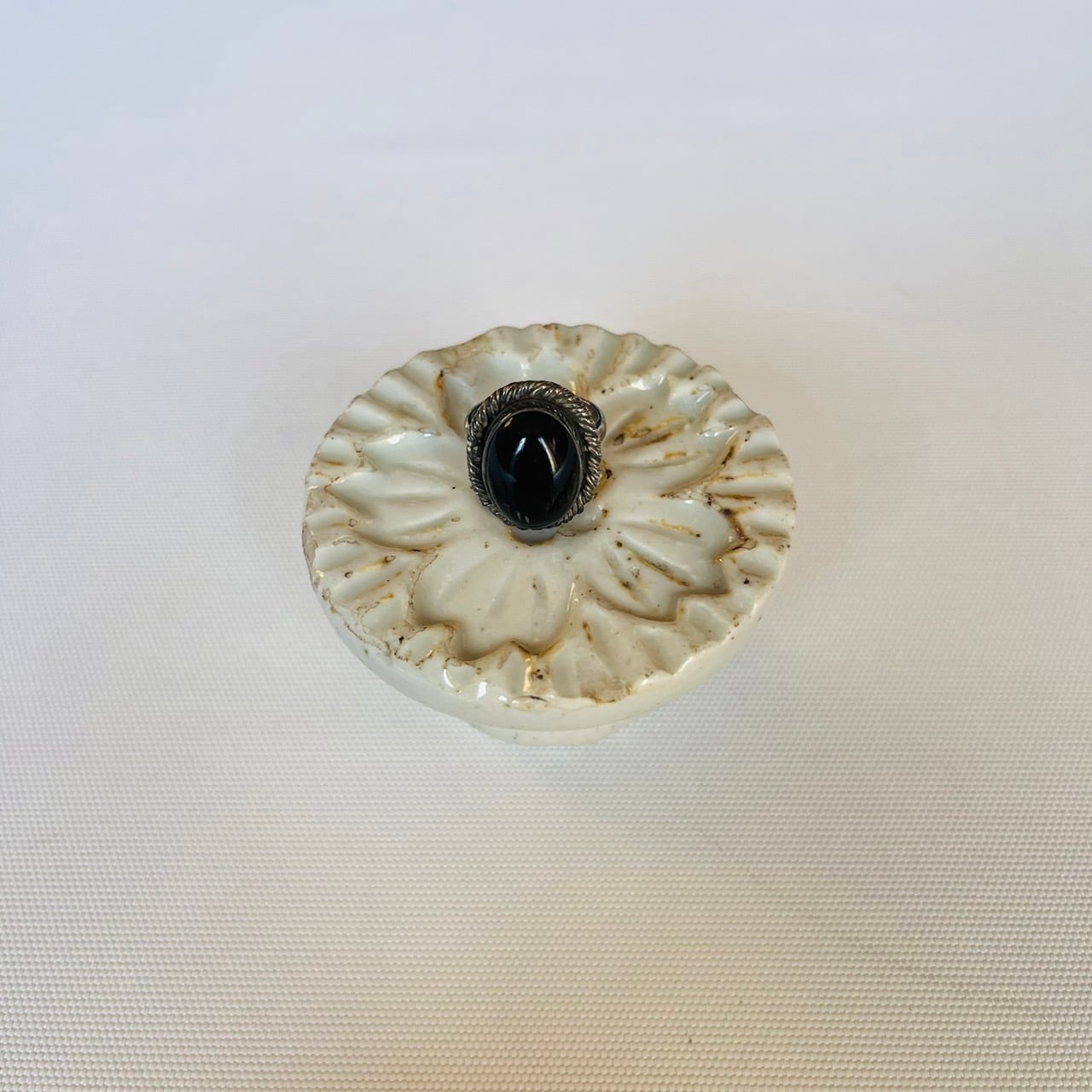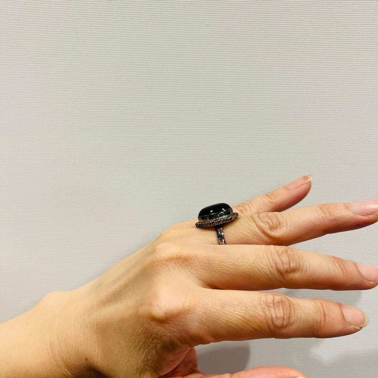 ハンドメイドの彫刻の台座に楕円形のオニキスリング。